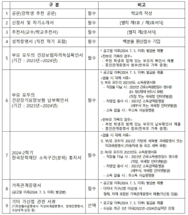 - 장학금은 고지된 등록금(2024년 2학기분) 내에서 지원 가능하며, 학교계좌로 지급